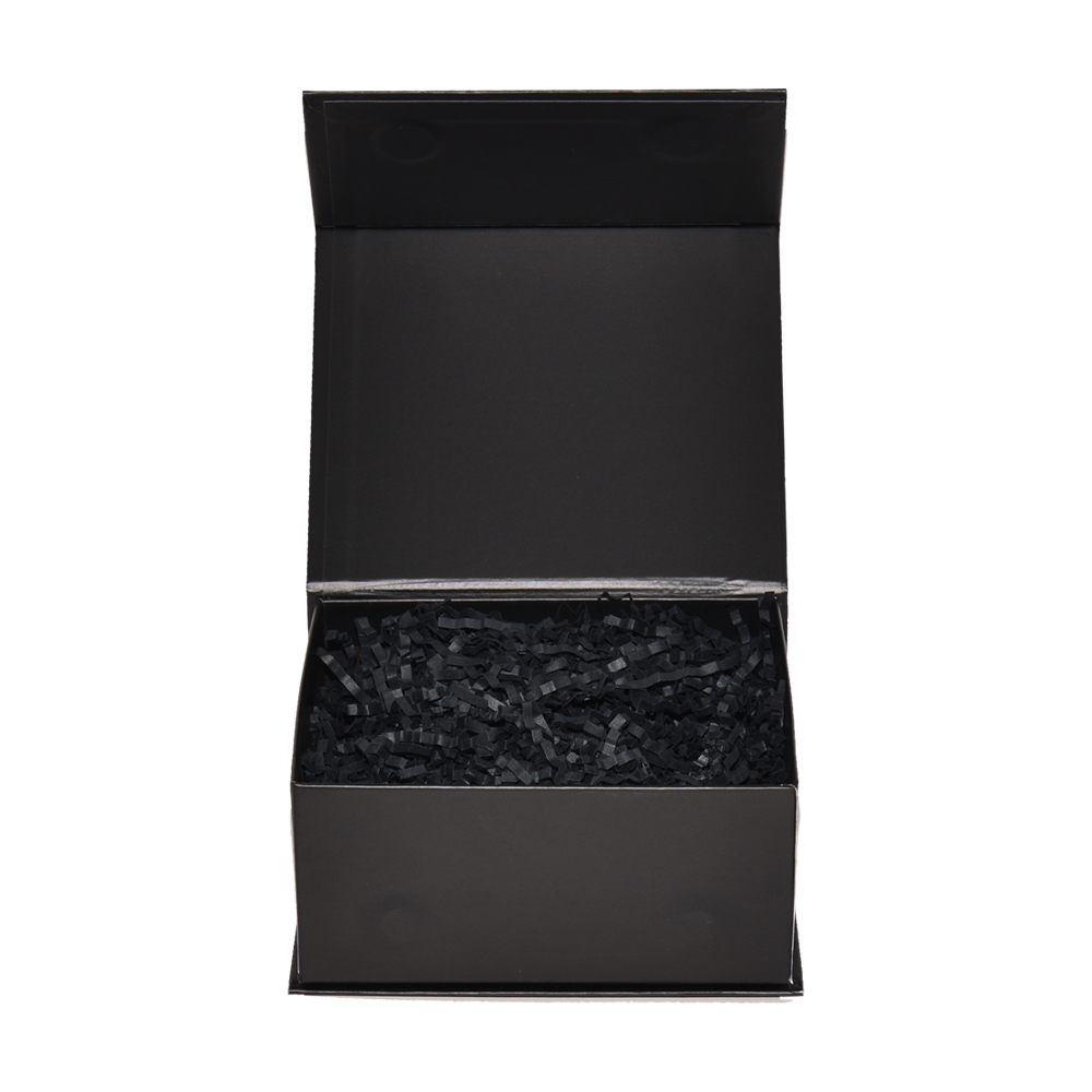 Elegant Matte Black Rigid Magnetic Closure Gift Box with Shredded Tissue Paper Holder for Cosmetics Packaging