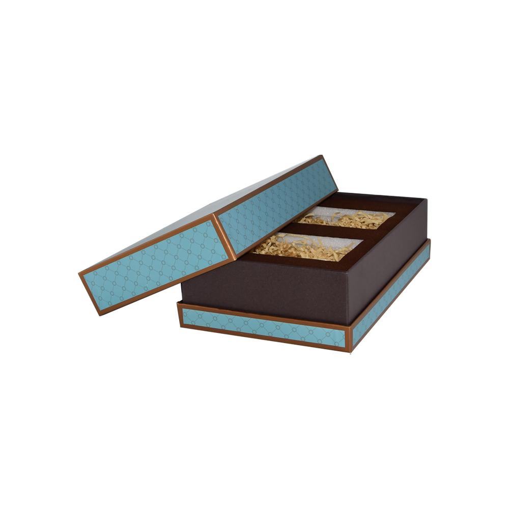 1. The dimension of the custom packaging box is customized, it is 12*4*3 cm.2. The material of the custom packaging box is 1200 GSM rigid paper, 157 GSM art paper, they are eco-friendly and recycled.