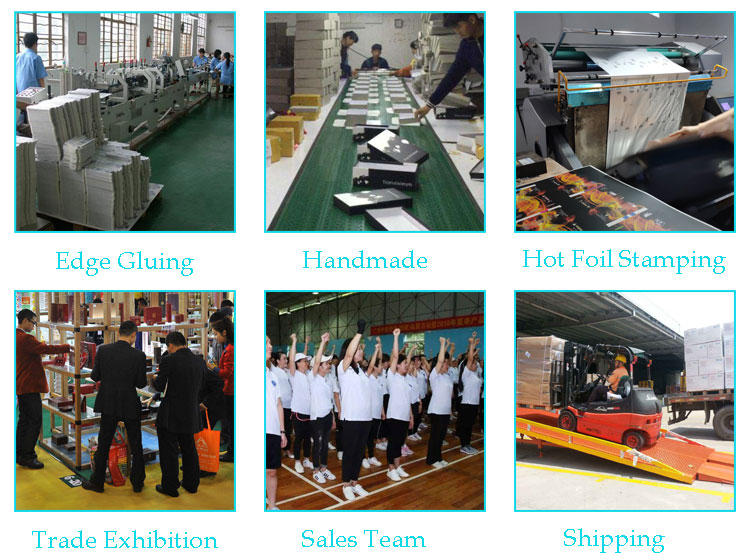 Atualmente, a Zhibang Packaging and Printing opera uma fábrica com uma oficina de 17.000 metros quadrados, 120 máquinas avançadas, 200 trabalhadores experientes e 20 engenheiros. Temos 2 máquinas de impressão offset da Heidelberg que podem garantir que todas as impressões em nossos produtos sejam perfeitas, 2 máquinas de corte e vinco automáticas do Japão que podem garantir que todos os pedidos possam ser atendidos em um curto espaço de tempo, 2 máquinas automáticas de laminação de filme do Japão que pode fazer a laminação de filme a 100.000 unidades / semana, 5 máquinas de remoção de bolhas da China que podem garantir que a superfície de todas as caixas de presente seja plana sem bolhas, mais de 20 máquinas que podem suportar a produção de produtos e testes de qualidade.