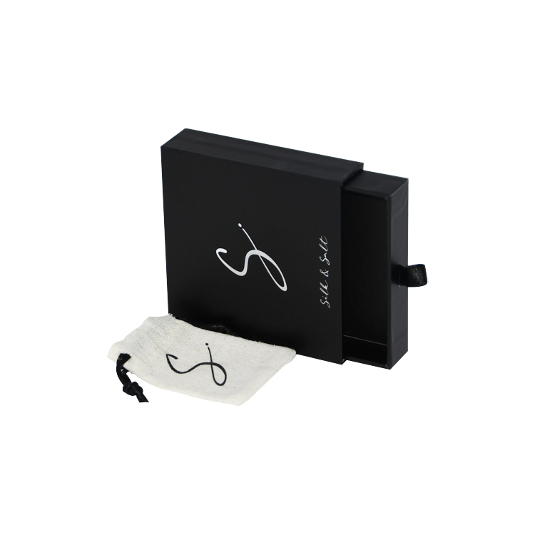•  Персонализированная коробка слайдера ящика для бумаги для упаковки ювелирных изделий с джутовыми мешками и логотипом для горячего тиснения серебряной фольгой